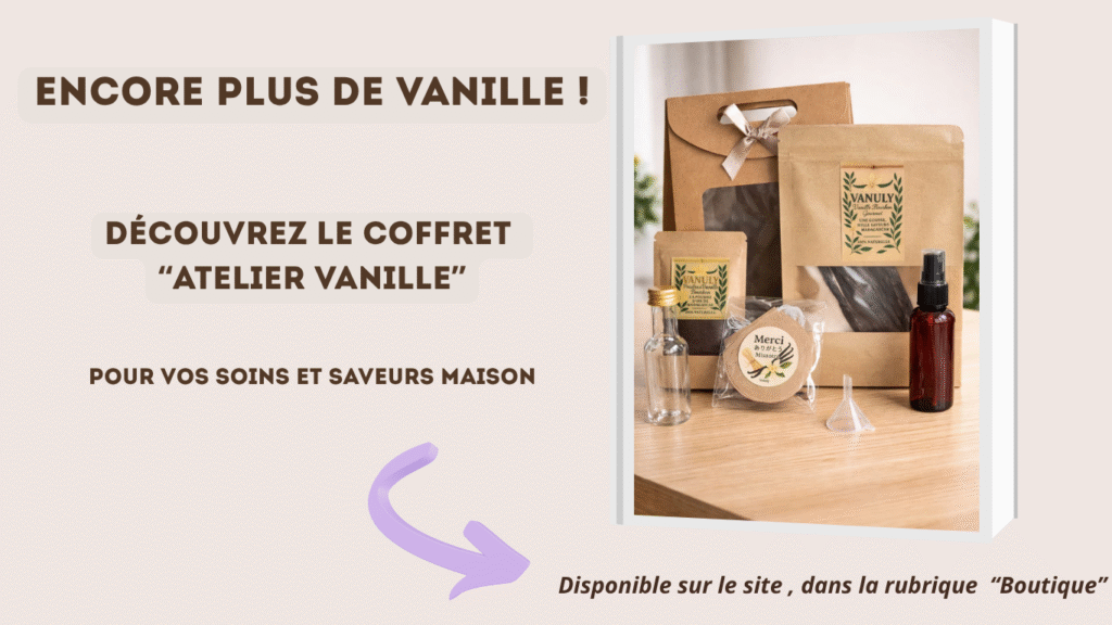 Introduction La vanille ne se limite pas à la cuisine. Ses arômes doux et relaxants en font un ingrédient idéal pour créer une huile de bien-être naturelle. Découvrez la recette DIY Vanuly pour fabriquer votre propre huile parfumée à la vanille de Madagascar. Ingrédients 50 ml d’huile végétale d’amande douce (ou huile de jojoba) 1 […]